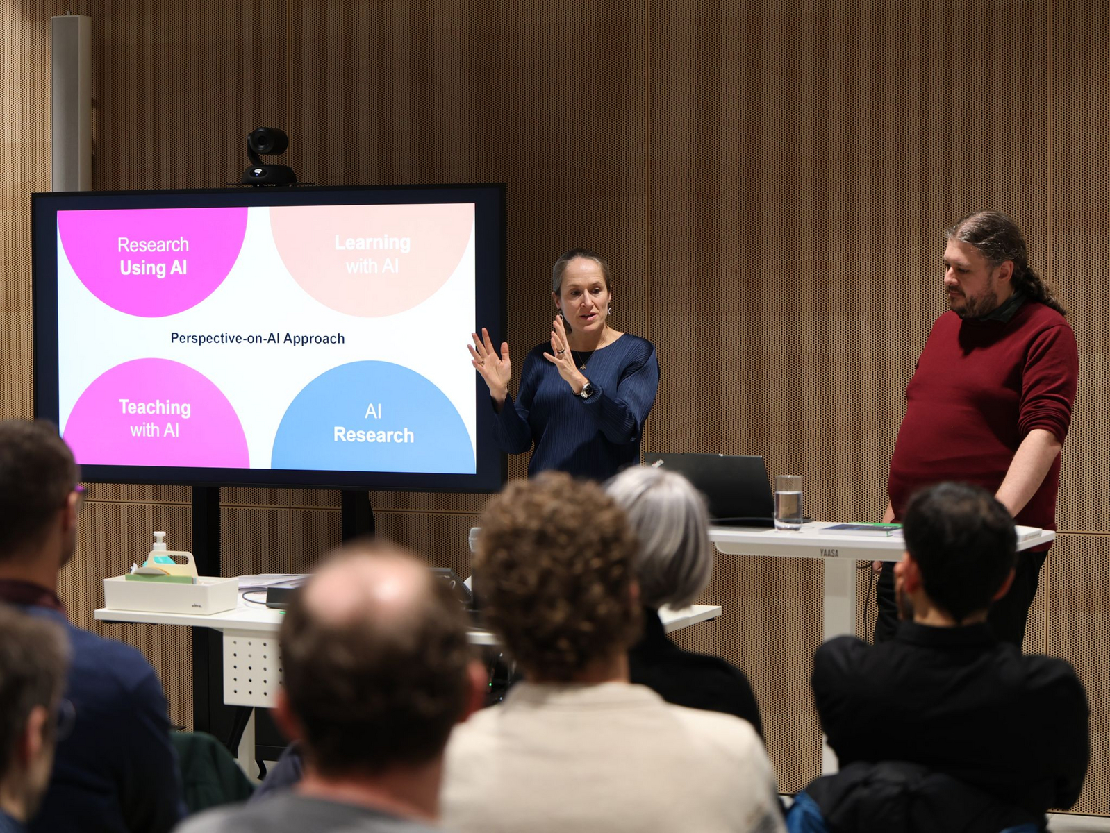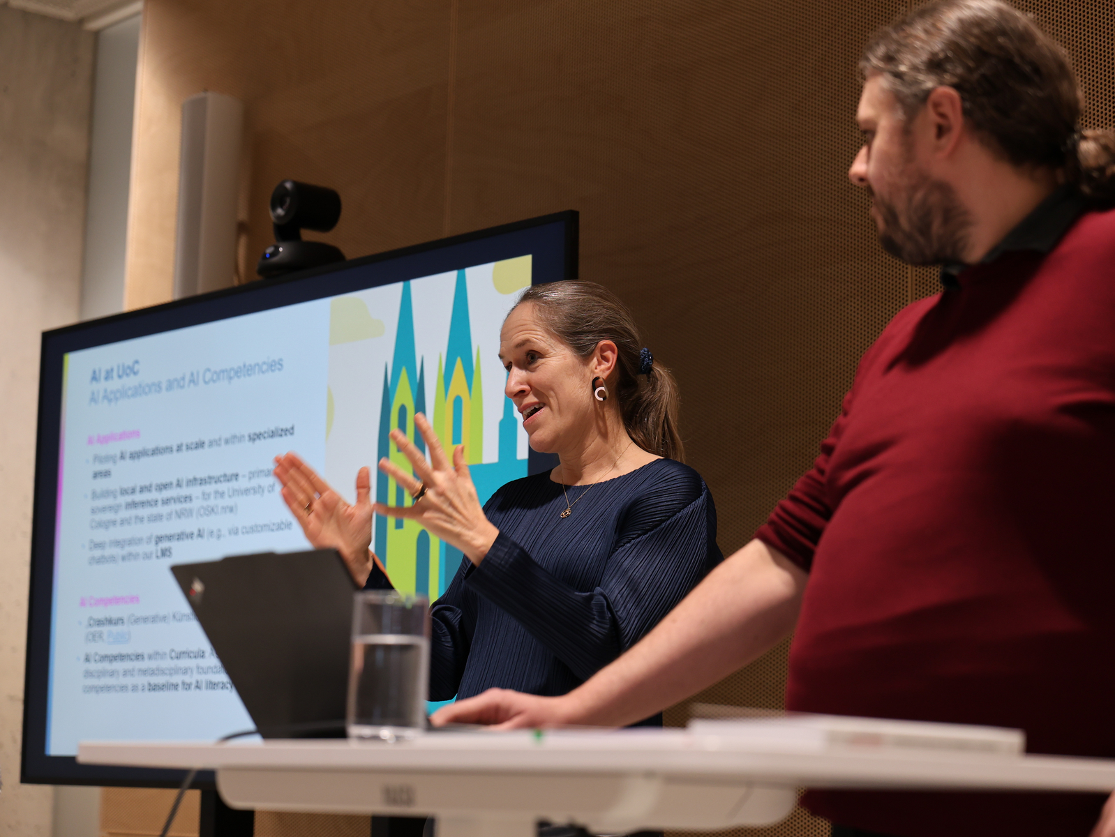Zu Beginn boten die Vorträge der Expertinnen und Experten einen fundierten Einstieg in die Thematik. Prof. Dr. Beatrix Busse, Prorektorin für Lehre und Studium der Universität zu Köln und verantwortlich für die Entwicklung einer universitätsweiten KI-Strategie, sowie Ingo Kleiber, Senior-Experte für Digitale Bildung und Educational Technology an der Universität zu Köln, betonten die Dringlichkeit des Themas: «Get ready for this transformation – now! We have to run.» Künstliche Intelligenz verändere die Hochschulbildung im Kern und damit auch das Lernen selbst. Dieser Wandel sei nicht umkehrbar, weshalb es gelte, sich intensiv mit Chancen und Risiken auseinanderzusetzen.