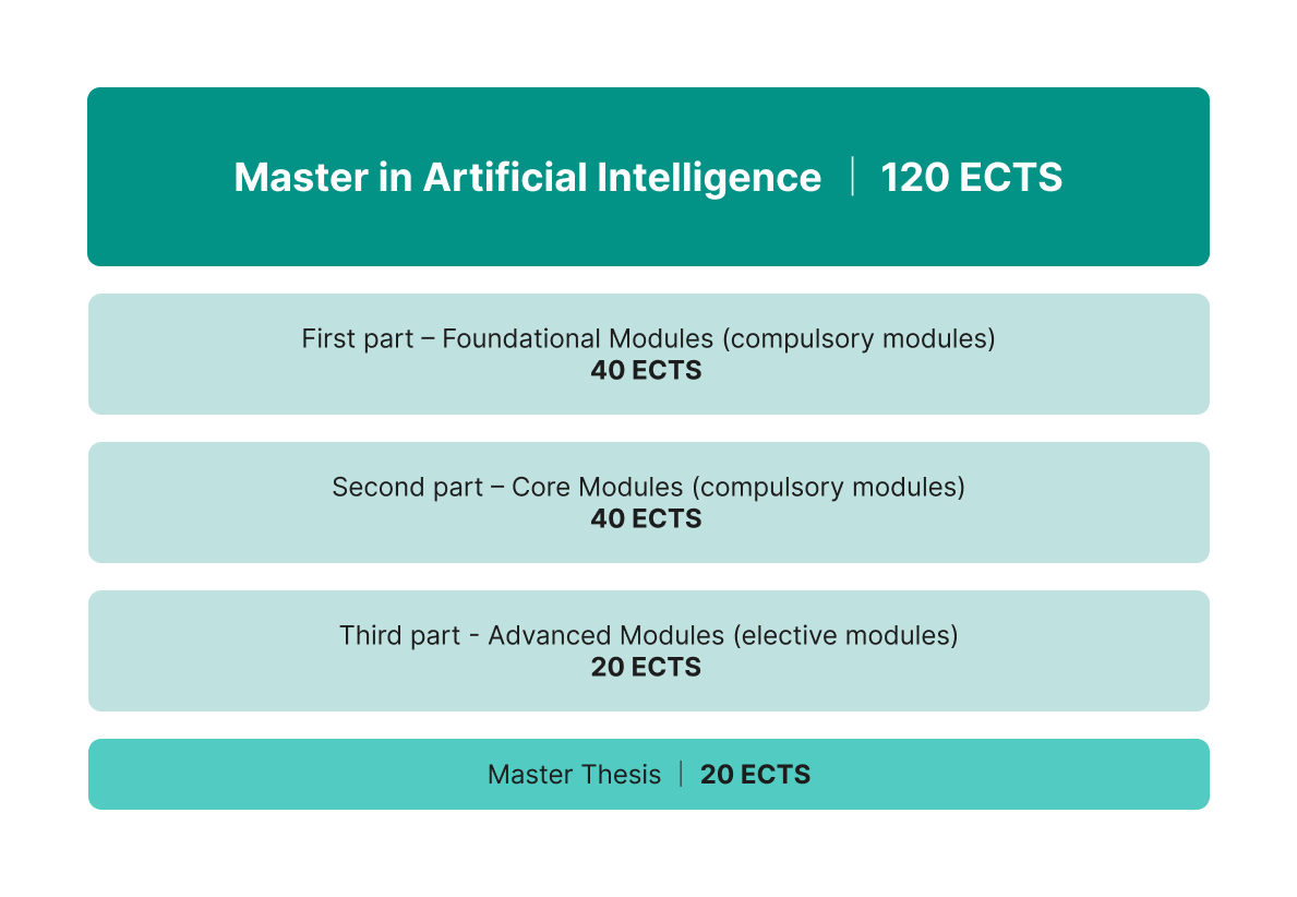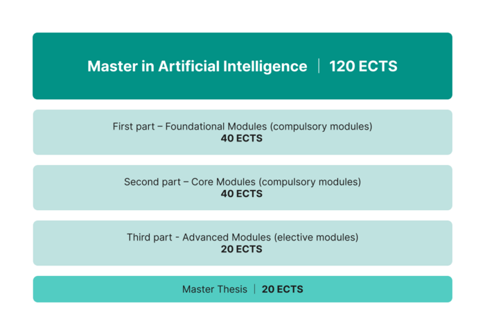 Der Masterstudiengang in KI umfasst 120 ECTS-Punkte. Ein Semester besteht aus zwei Modulen à 10 ECTS, insgesamt also 20 ECTS pro Semester. In der Regel dauert der Erwerb dieser ECTS 3 Jahre.